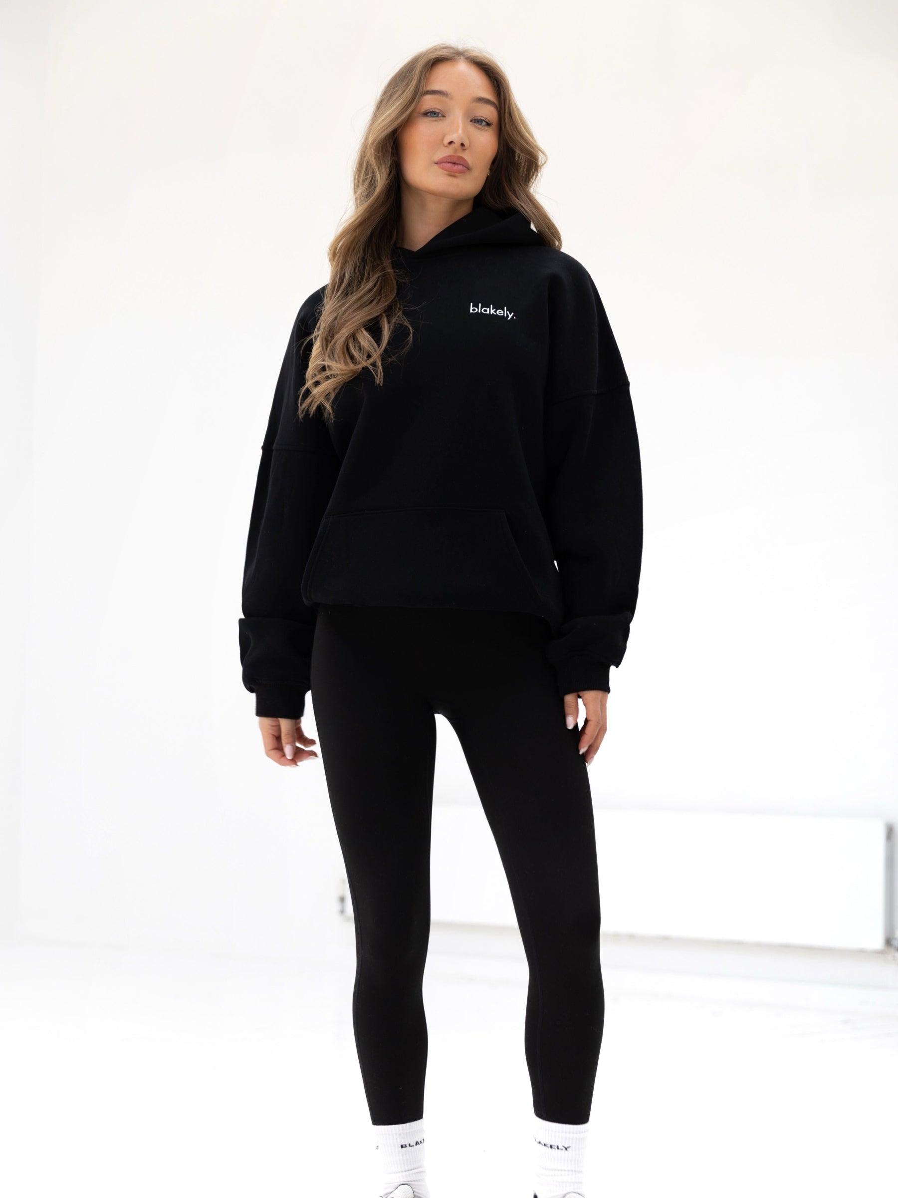 Our Sami Hoodie in Black features an oversized fit and a roomy front pocket, making it ideal for everyday activities and lounging. It also showcases a small Blakely logo in a thinner font, which complements the rest of the collection.